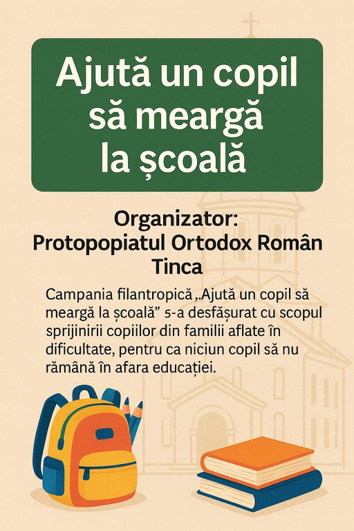 Anul acesta, începutul noului an școlar, care a coincis cu marea sărbătoare a Nașterii Maicii Domnului, a fost întâmpinat cu o nouă activitatesocial-filantropică, în cuprinsul Protopopiatului Tinca, așa cum deja s-a obișnuit în ultimii ani, acest fapt devenind o frumoasă tradiție.