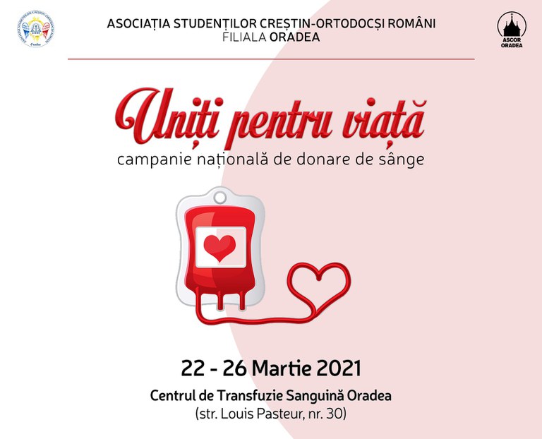 Cu binecuvântarea Preafericitului Părinte Patriarh Daniel, Asociația Studenților Creștin-Ortodocși Români derulează, în perioada 22 Martie - 6 Aprilie 2021, o amplă campanie de donare de sânge, intitulată „Uniți pentru viață”.