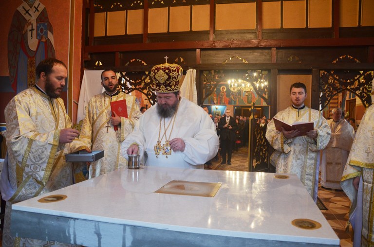Duminică, 16 octombrie 2016, în sunetul clopotelor, Preasfinţitul Părinte Sofronie a fost întâmpinat cu mare bucurie de mulțime de copii și tineri înveșmântați în frumoase straie populare tradiționale din Bihor, de un sobor de preoţi şi diaconi, bărbaţi cu prapuri şi mulţime de credincioşi. A urmat slujba de târnosire a bisericii și săvârșirea Sfintei Liturghii arhierești pe altarul proaspăt sfințit.