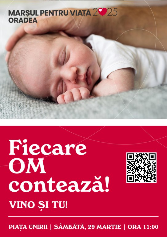 Sâmbătă, 29 martie, ora 11,00 în Oradea, Asociația Părinți pentru Ora de Religie filiala Bihor, cu sprijinul cultelor creștine din judetul Bihor, organizează, Marșul pentru viață 2025, sub genericul „Fiecare om contează”.