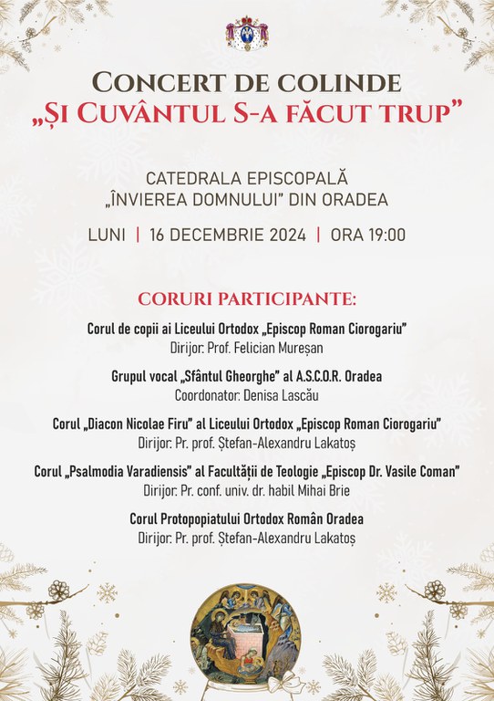 La fel ca în ceilalți ani, Episcopia Ortodoxă Română a Oradiei are bucuria de a-i invita pe toți credincioșii la Concertul de colinde „Și Cuvântul S-a făcut trup”, care va avea loc la Catedrala Episcopală „Învierea Domnului” din Oradea, luni, 16 decembrie 2024, de la ora 19:00.