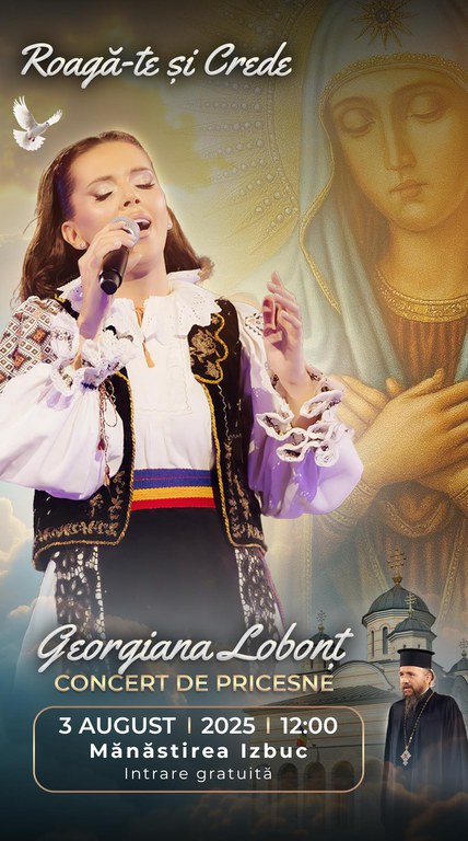 Întru încununarea acestui praznic al sufletului, la ora 12:00, va avea loc un moment cultural-artistic de înaltă ținută duhovnicească, susținut de artista GEORGIANA LOBONȚ, împreună cu invitații și colaboratorii săi. Sub bolta îndemnului creștin „Roagă-te și crede”, va fi oferit un recital de pricesne, împodobit cu evlavie și trăire autentică. Prin glasul său blând și rugător, artista – cunoscută pentru atașamentul față de valorile credinței strămoșești – va aduce, prin cânt, prilejul unei profunde mișcări sufletești.