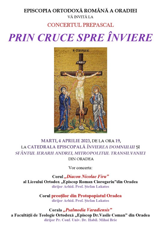 Episcopia Oradiei vă invită la îndătinatul concert prepascal Prin Cruce spre Înviere la Catedrala Episcopală „Învierea Domnului” și „Sfântul Ierarh Andrei, Mitropolitul Transilvaniei” din Oradea, marți 4 aprilie 2023, începând cu orele 19:00.