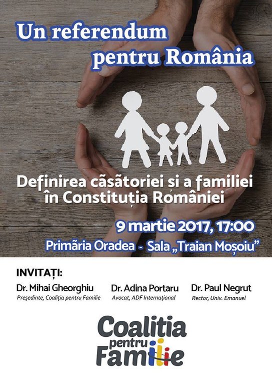 În după-amiaza zilei de joi, 9 martie 2017, sala festivă „Traian Moșoiu” a Primăriei Oradea a fost gazda unei dezbateri publice organizată de Coaliţia pentru Familie, cu scopul de a promova demersul început în urmă cu doi ani, a cărui finalitate se doreşte a fi modificarea, prin referendum național, a articolului 48, aliniatul 1 din Constituția României, referitor la familie, prin definirea precisă a căsătoriei între un bărbat și o femeie, proiect în favoarea căruia s-au strâns peste 3 milioane de semnături la nivel național, iar în județul Bihor peste 103.000 de semnături.