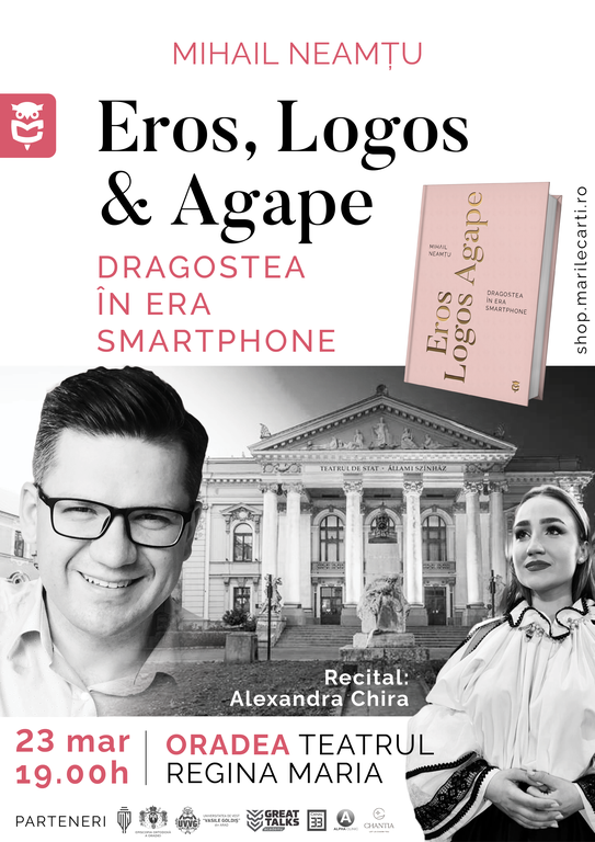 Episcopia Ortodoxă Română a Oradiei și cu Protopopiatul Ortodox Român Oradea, în colaborare cu Clubul Marile Cărți, vă invită, joi, 23 martie 2023, la conferința Eros, Logos & Agape. Dragostea în era smartphone, susținută de teologul și scriitorul Mihail Neamțu, care va avea loc în sala mare a Teatrului Regina Maria din Oradea, începând cu orele 19:00. Conferința va debuta printr-un recital susținut de tânăra și cunoscuta artistă Alexandra Chira, câștigătoarea primei ediții a concursului „Vedeta populară” de la TVR1.