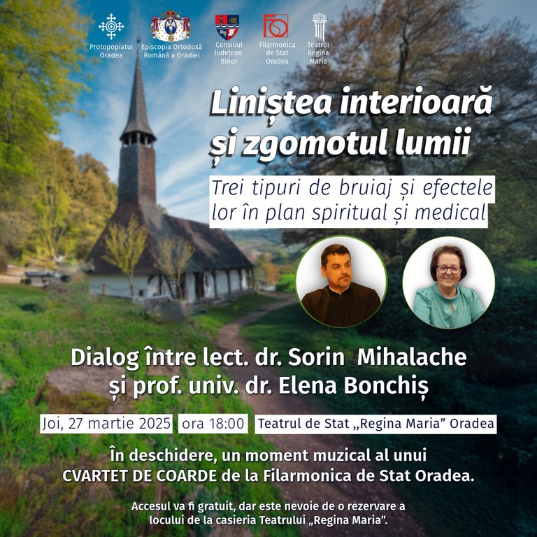 Joi, 27 martie 2025, de la ora 18:00, la Teatrul de Stat „Regina Maria” din Oradea este organizată o seară de dialog între lect. dr. Sorin Mihalache și prof. univ. dr. Elena Bonchiș. Tema discuției va fi „Liniștea interioară și zgomotul lumii. Trei tipuri de bruiaj și efectele lor în plan spiritual și medical”.