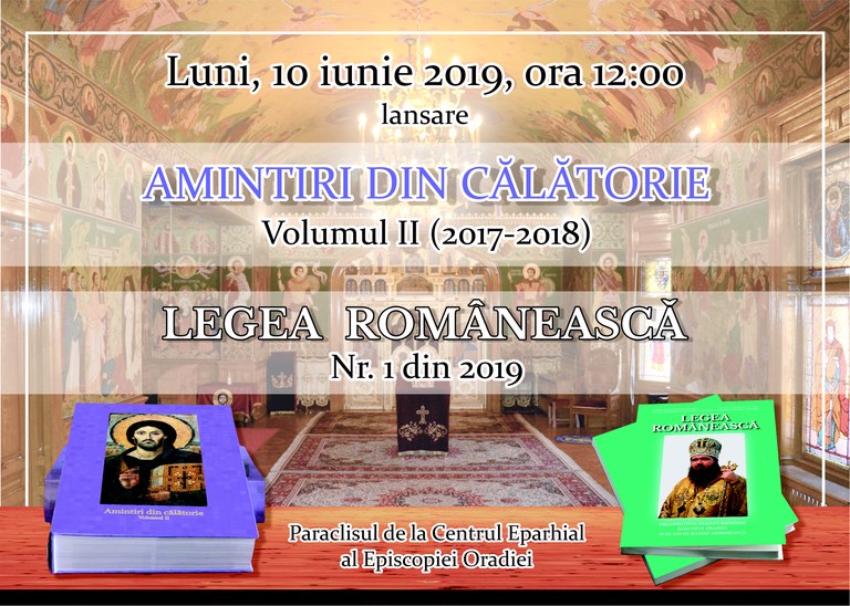 Cu acest prilej, luni, 10 iunie 2019, de la ora 12, în paraclisul de la Centrul Eparhial al Episcopiei Oradiei va avea loc, cu binecuvântarea și în prezența Preasfințitului Părinte Episcop Sofronie, lansarea festivă a albumului Amintiri din călătorie, volumul II, și a revistei eparhiale Legea Românească, numărul 1 din 2019.