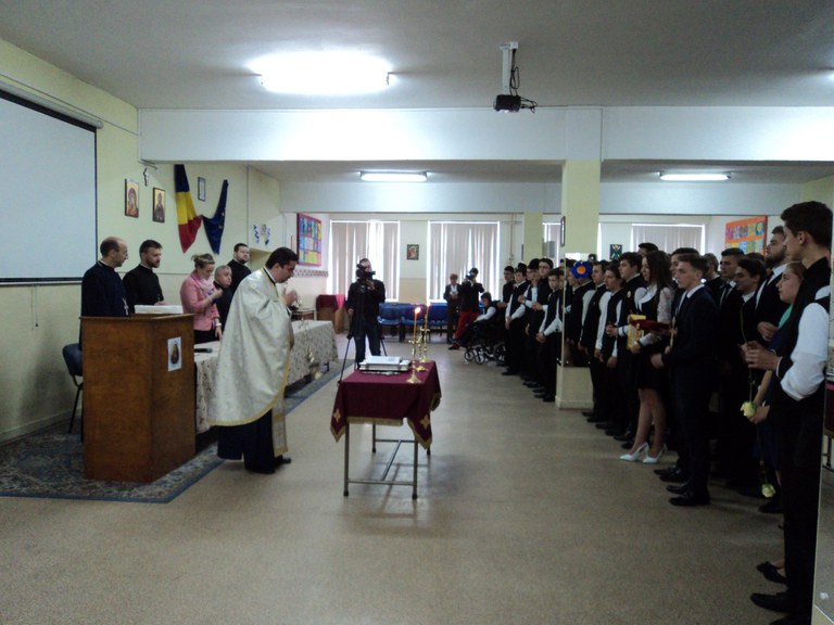 La auzul ultimului sunet de clopoțel, absolvenții s-au îndreptat spre sala festivă, cântând tradiționalul imn „Gaudeamus igitur”, unde au fost întâmpinați de către colegii din clasele mai mici, împreună cu cadrele didactice și alți invitați, și unde s-a săvârșit slujba Te-Deum-ului de mulțumire.