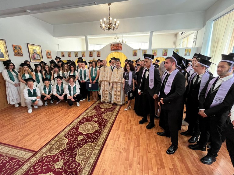 Momentul festiv al zilei de joi, 6 iunie a debutat în Paraclisul cu hramul „Sfântul Niceta de Remesiana”, unde tinerii absolvenți au participat la Sfânta Liturghie și la slujba de Te-Deum, alături de dascălii care i-au format, aducând mulțumire lui Dumnezeu pentru ajutorul și darurile revărsate pe parcursul anilor de liceu. În cuvântul ocazional, Preacucernicul Părinte Radu Rus, Vicar administrativ și Director al Liceului Ortodox a pus la inima absolvenților teologi și filologi deopotrivă, îndemnul de a nu uita niciodată faptul că au studiat într-o școală teologică, o școală a Bisericii, și mai ales faptul că între multele prietenii legate în această școală, cea mai importantă este prietenia cu Hristos, la care nu trebuie să renunțe niciodată.