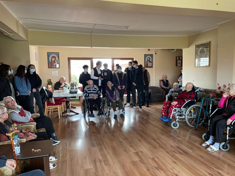 Centrul adăpostește 29 de persoane in vârsta care i-au primit bucuroși pe elevii scolii noastre. Liceenii au pregătit un scurt program de pricesne și cântece dedicate mamei, unele cântate chiar împreună cu gazdele lor. Doamnele prezente au primit câte o floare în dar, în semn de apreciere și recunoștință pentru dăruirea, curajul și imaginea femeii ca icoana a sufletului nostru. Toți cei prezenți au primit și o doză de vitamine si sănătate oferite și pregătite cu drag de liceeni. Sfârșitul vizitei a fost marcat de un moment de comuniune în rugăciune, oficiat de părintele Alin Berce împreună cu elevii teologi.