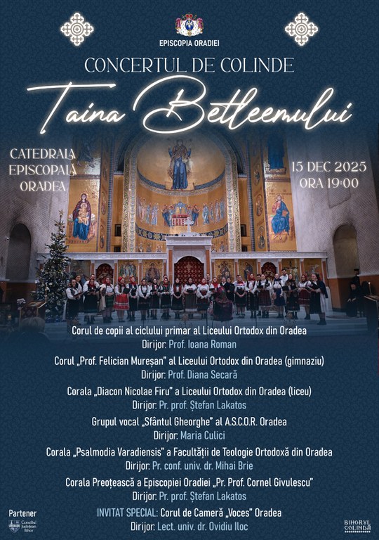 Episcopia Ortodoxă Română a Oradiei organizează, cu sprijinul Consiliului Județean Bihor, luni, 15 decembrie 2025, începând cu ora 19:00, la Catedrala Episcopală „Învierea Domnului”, Concertul de Colinde „Taina Betleemului”.