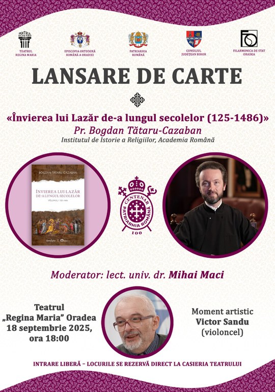 Consiliul Județean Bihor, în parteneriat cu Episcopia Ortodoxă Română a Oradiei, organizează un eveniment cultural de excepție care va avea loc joi, 18 septembrie 2025, de la ora 18:00, la Teatrul de Stat „Regina Maria” din Oradea: lansarea volumului părintelui dr. Bogdan Tătaru-Cazaban, „Învierea lui Lazăr de-a lungul secolelor. Volumul I: 125–1486”, apărut la Editura Spandugino.