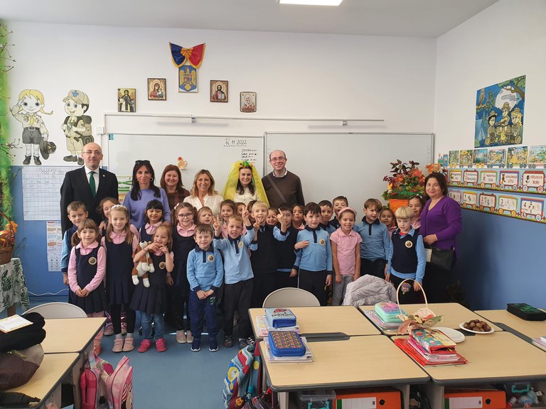 Astfel, în ziua sosirii, conducerea scolii noastre, și-a întâmpinat oaspeții alături de un grup de copii îmbrăcați in port popular, care i-au servit cu pâine si sare, precum si de corul clasei a V-a B care au interpretat un cântec în limba italiană dirijați de părintele profesor Ștefan Lakatos. Oaspeții au vizitat școala rămânând foarte plăcut impresionați de atmosfera caldă și respectuoasă care predomină.