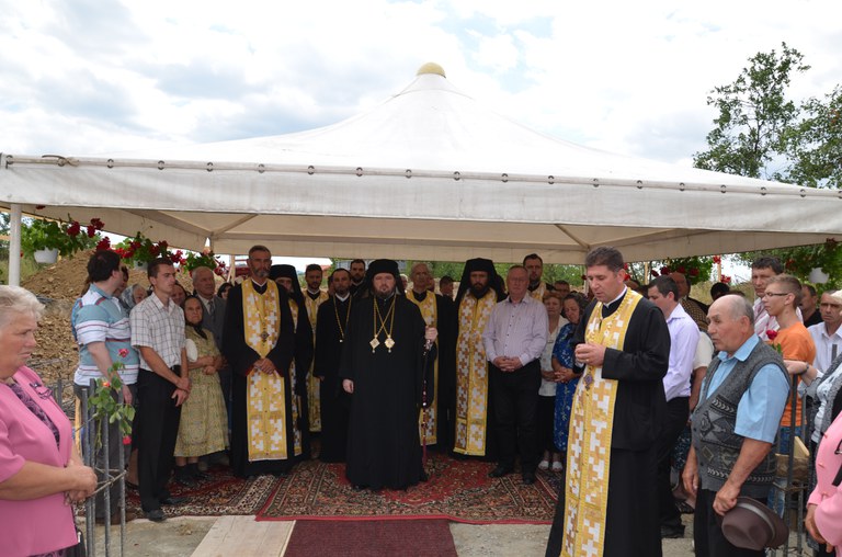 După Sfânta Liturghie, Chiriarhul Oradiei, împreună cu frumosul sobor de ieromonahi, preoţi şi diaconi şi poporul dreptmăritor prezent, cu prapuri şi icoane, în imne şi cântări de biruinţă, s-a deplasat la locul unde se va construi noul locaş de cult şi a oficiat slujba de sfinţire a pietrei de temelie a noii biserici parohiale cu hramurile „Buna Vestire” şi „Adormirea Maicii Domnului”.