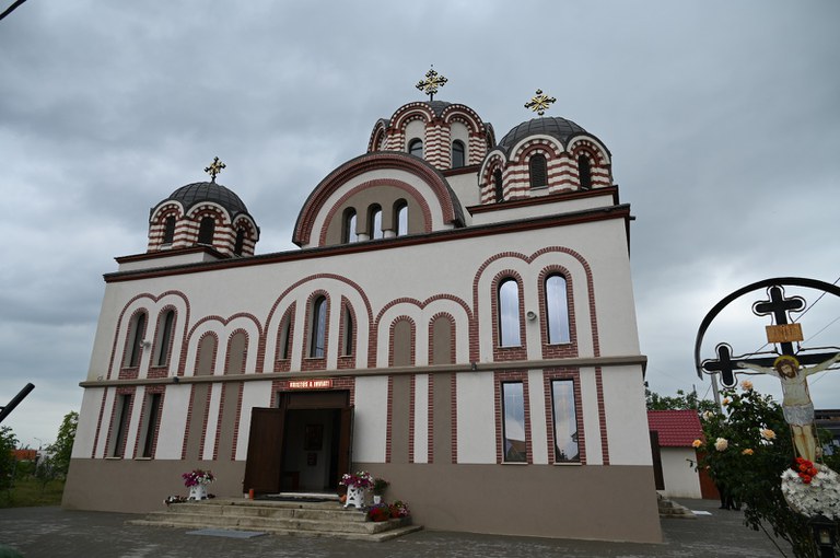Biserica parohială îi are ca și ocrotitori pe Sfântul Ierarh Vasile cel Mare și pe Sfânta Mare Muceniță Ecaterina. Din punct de vedere arhitectural, la inițiativa Chiriarhului locului, lăcașul de cult este o oglindire reușită a bisericii închinate aceleiași Sfinte Ecaterina din Tesalonic, Grecia, impresionând încă de la prima vedere prin aspectul exterior cu totul aparte.