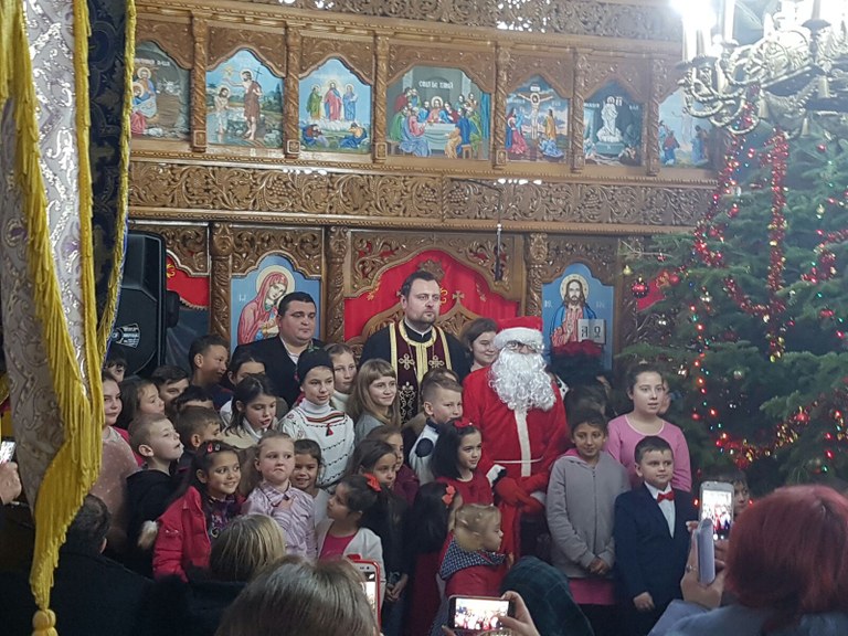 Duminică, la finalul Sfintei Liturghii, după ce s-au împărtășit cu Sfintele Taine, în prezența credincioșilor și a părinților, copiii au susținut cu multă emoție programul serbării de Crăciun. Colindele din străbuni care vestesc şi laudă Naşterea Mântuitorului Iisus Hristos s-au împletit cu poezii despre mărita sărbătoare şi despre anotimpul în care o celebrăm. Un moment foarte apreciat de copii a fost prezența lui Moș Crăciun, care, încărcat de daruri, a intrat în biserică în timp ce aceștia cântau colindul „Moș Crăciun cu plete dalbe”.