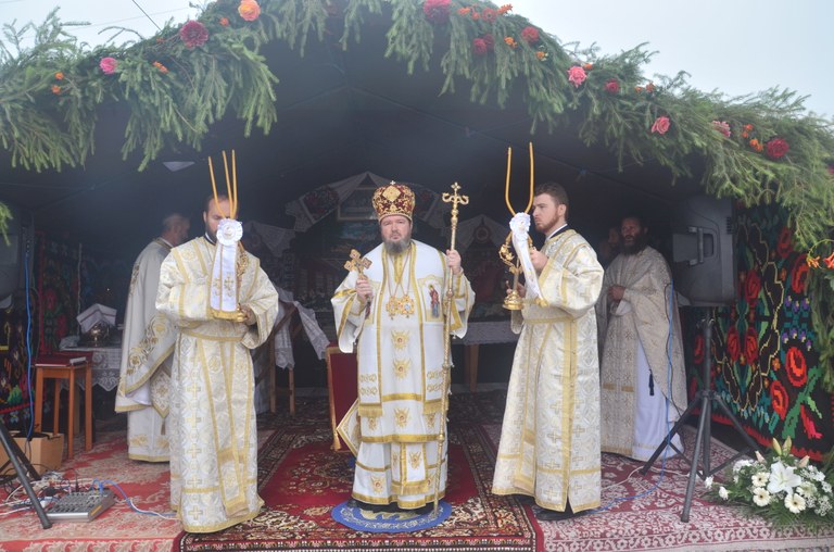 În sunetul clopotelor, Preasfinţitul Părinte Sofronie a fost întâmpinat cu mare bucurie de un frumos sobor de ieromonahi, preoţi şi diaconi, bărbaţi cu prapuri şi mulţime de credincioşi. A urmat slujba de târnosire a bisericii și Sfânta Liturghie arhierească.