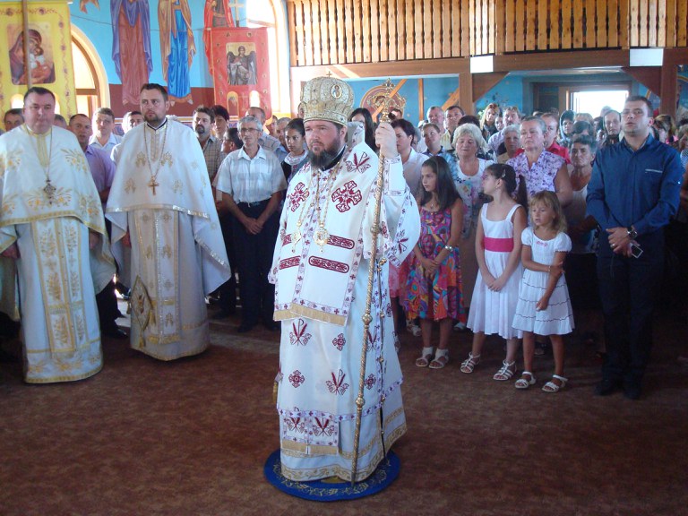 Preasfinţia Sa a fost întâmpinat cu mare cinste, în sunetul clopotelor, de un sobor de 13preoţi şi 3 diaconi, bărbaţi cu prapori şi mulţime impresionantă de credincioşi. A urmat slujba de târnosire a bisericii, prin înconjurarea, stropirea cu apă sfinţită şi ungerea acesteia cu Sfântul şi Marele Mir. Ceremonia a continuat cu înveşmântarea Sfintei Mese, aşezarea moaştelor în piciorul ei, sfinţirea catapetesmei şi a picturii.