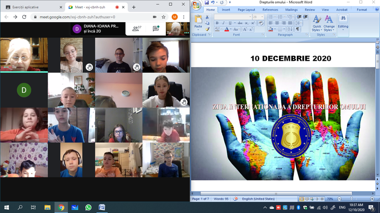 În a doua parte a activității, elevii au primit sarcina ca, pornind de la activitatea din clasă, să realizeze câte o lucrare individuală în care să reprezinte, plastic sau literar, un drept al omului. Aceste lucrări vor constitui temele unei expoziții, alături de cele realizate în cadrul activității „World’s Largest Lesson 2020”, inițiat de UNICEF cu ocazia sărbătoririi Zilei Internaționale a Drepturilor Copilului, pe 20 noiembrie, dată care marchează adoptarea Convenției cu privire la drepturile copilului.